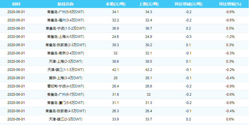 2020年6月1日沿海煤炭运费