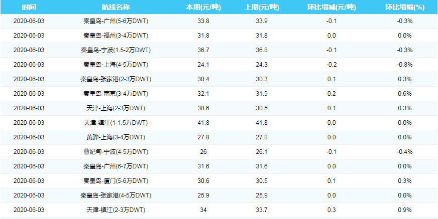 2020年6月3日沿海煤炭运费