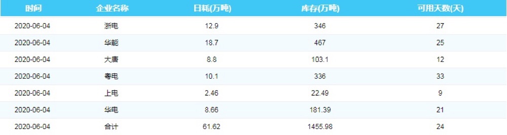 2020年6月4日沿海六大电厂煤炭供耗存指数