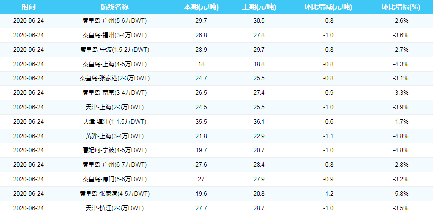 2020年6月24日沿海煤炭运费