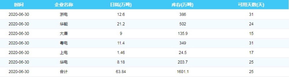 2020年6月30日沿海六大电厂煤炭供耗存指数