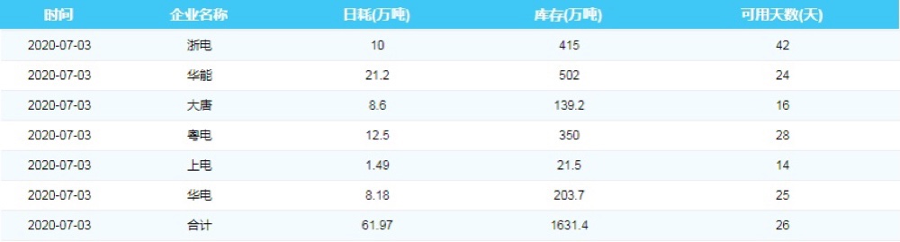 2020年7月3日沿海六大电厂煤炭供耗存指数