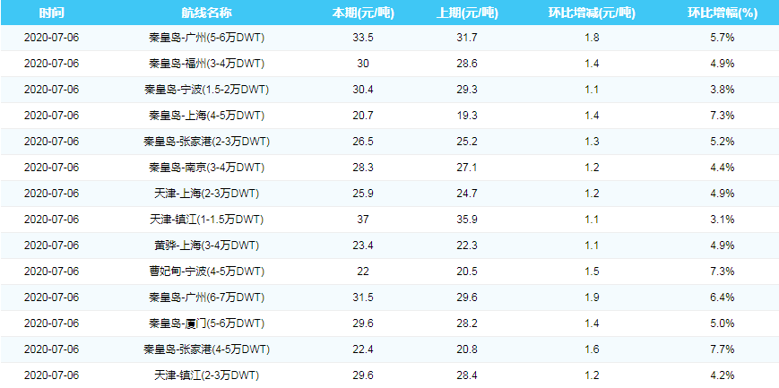 2020年7月6日沿海煤炭运费