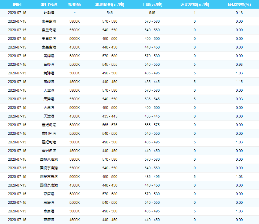 2020年7月15日沿海六大电厂煤炭供耗存指数