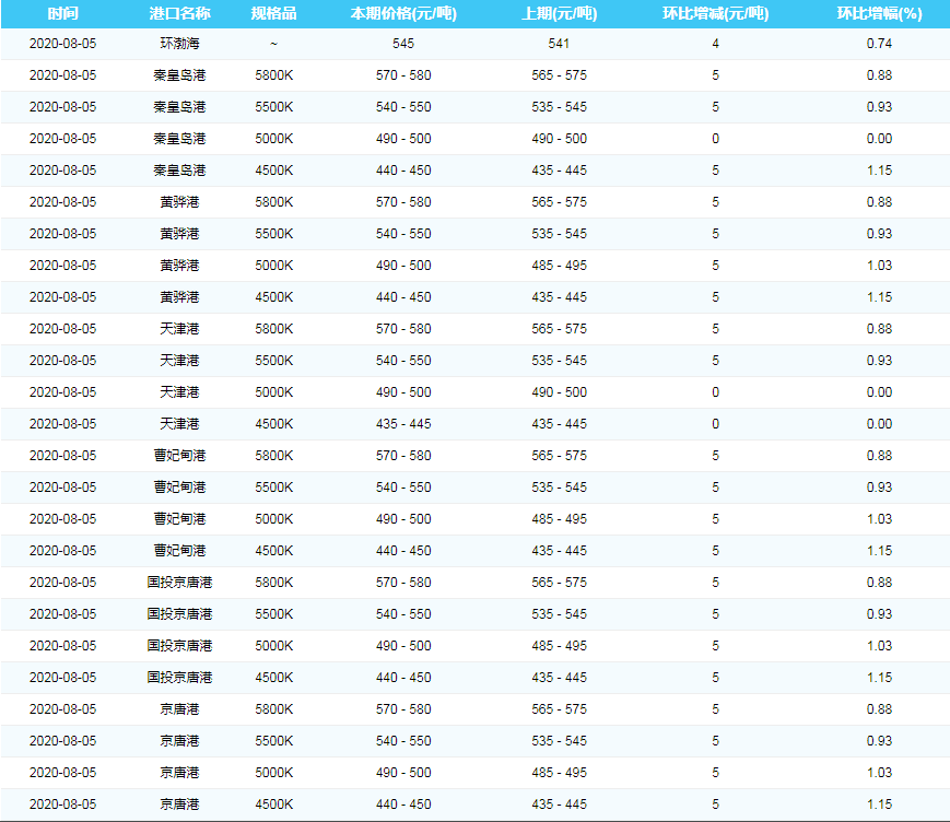 2020年8月5日沿海煤炭运费