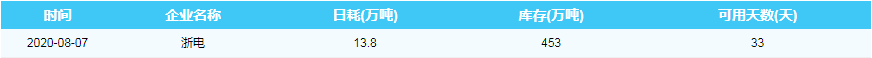 2020年8月7日沿海六大电厂煤炭供耗存指数