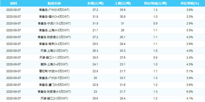 2020年8月7日沿海煤炭运费