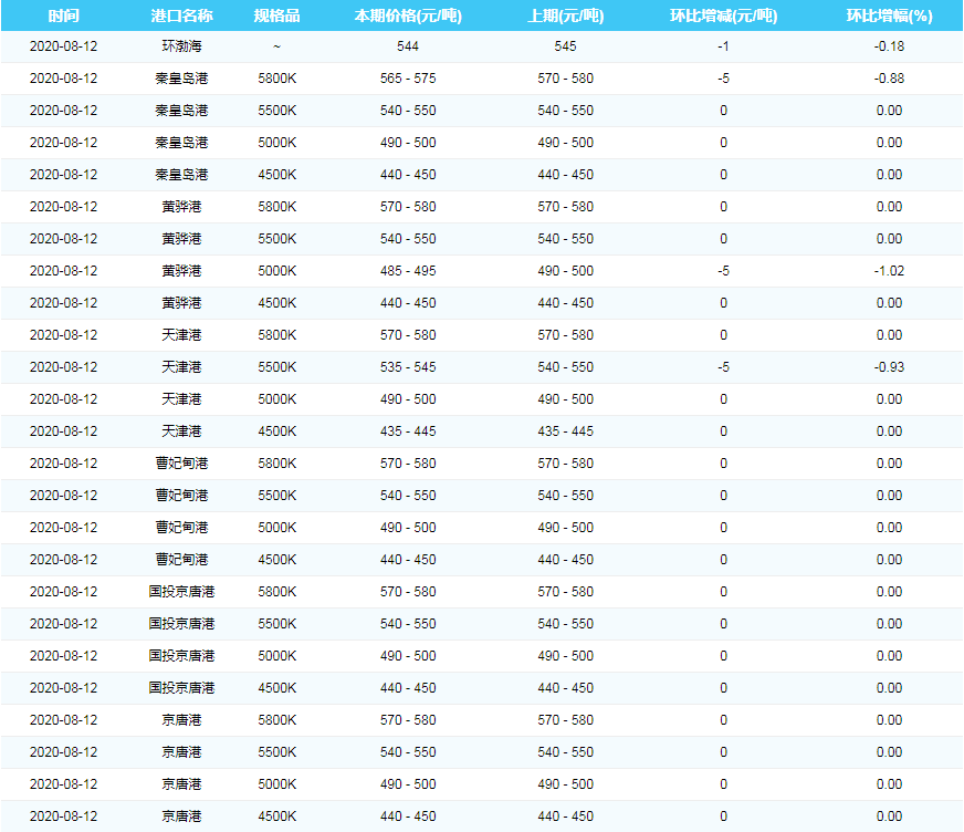 2020年8月12日沿海煤炭运费