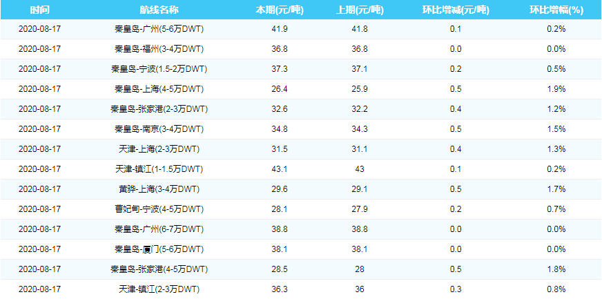 2020年8月17日沿海煤炭运费