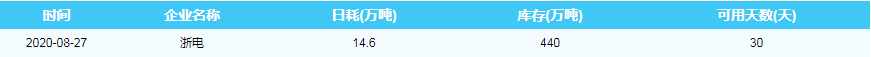 2020年8月27日沿海六大电厂煤炭供耗存指数