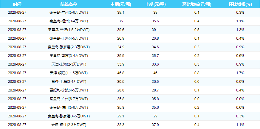 2020年8月27日沿海煤炭运费