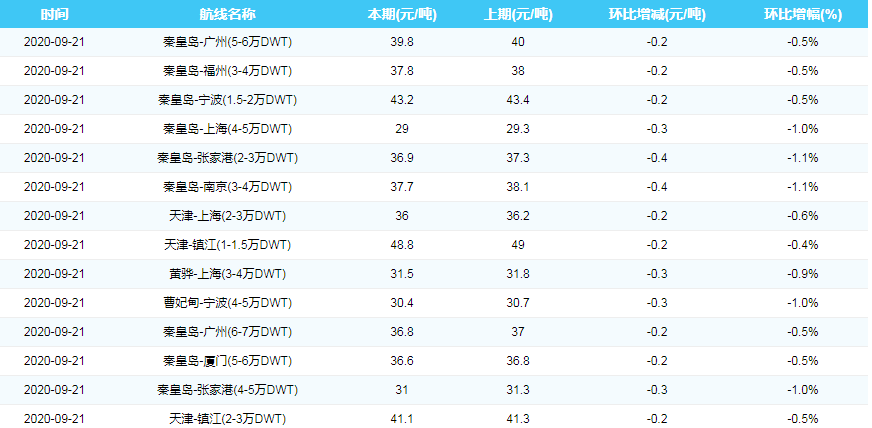 2020年9月21日沿海煤炭运费